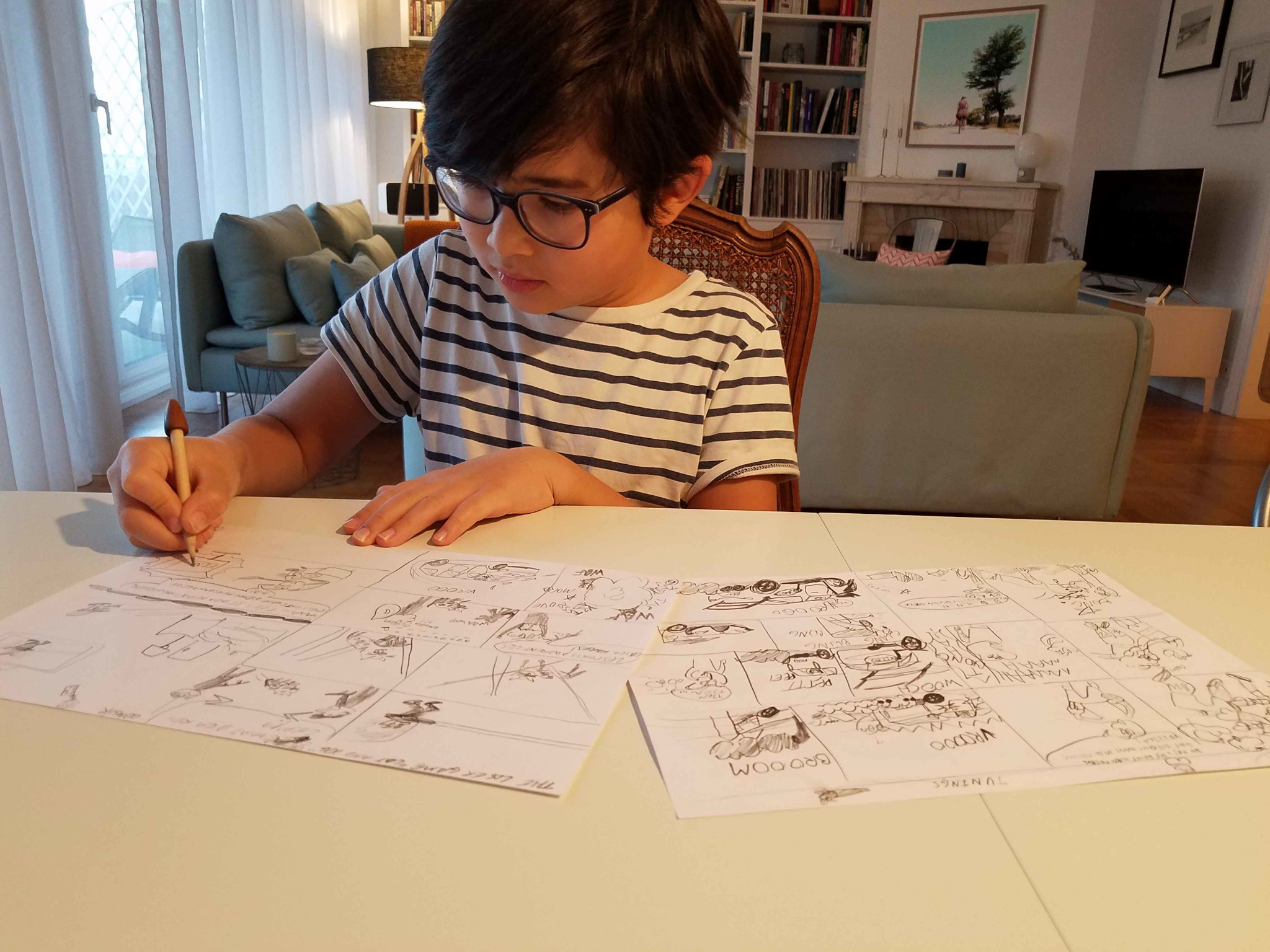 Sur ce blog vous pourrez lire les planches de ma première BD, “Les aventures de T.T., Tome 1 : Chic, une idée”. Cette BD est née à peu près comme dans la première histoire, mais en réalité je ne me suis pas cogné sur le haut de la porte.